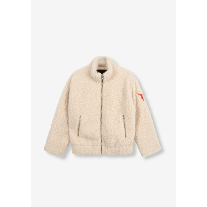 Abrigo de gran tamaño confeccionado en tejido de peluche.Diseñado con dos bolsillos en la parte delantera.Con un bordado de toro en la manga.