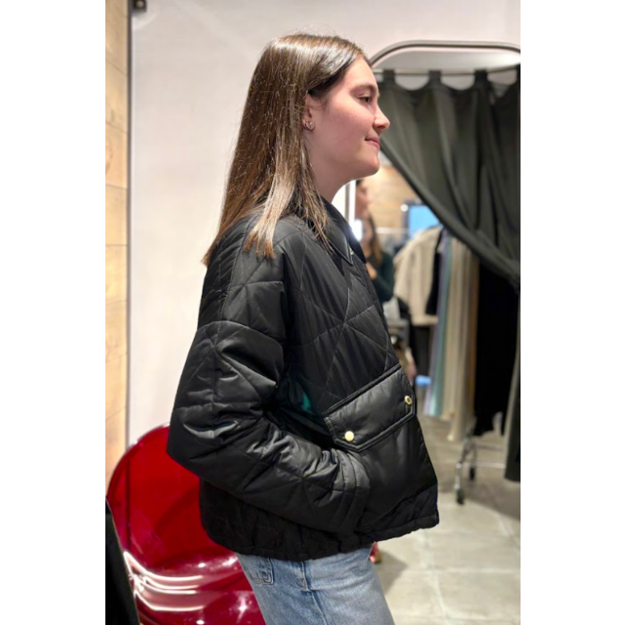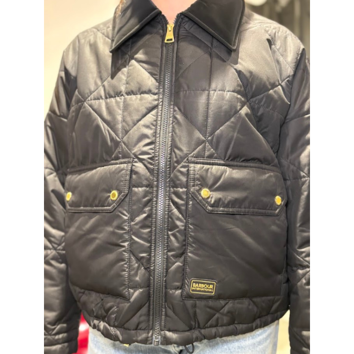Mejora tu vestuario casual con la chaqueta acolchada Juliana de Barbour International. Este elegante modelo corto presenta un lujoso cuello de terciopelo y bolsillos de parche extragrandes que le aportan practicidad y estilo.