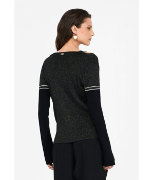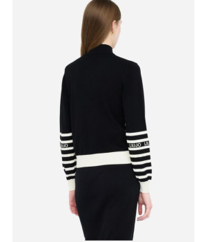Cárdigan de punto de mezcla de viscosa y lurex®Tejido en punto canaléDetalles de encajeMotivo de rayas en las mangasEscote de picoManga largaLogotipo metálico en la parte traseraCierre con botonesProducto "Liu Jo Better"