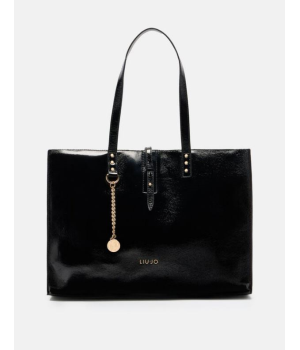 Medidas: 40 x 15 x 29 cmBolsa de compras brillanteMini tachuelas aplicadasLogo de metalMangos cómodosCorrea ajustable y removibleEncanto con logo y cadenaCierre de cremallera con correaForro contrastanteEl accesorio también se puede llevar al hombro y/o cruzado