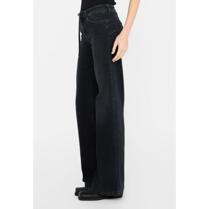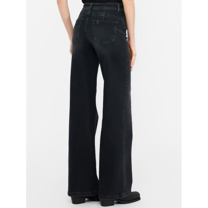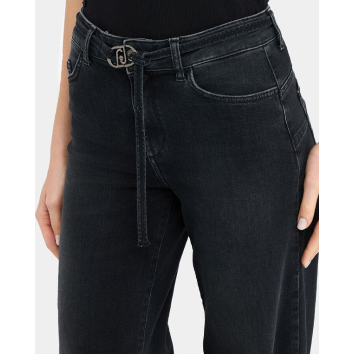 Vaqueros negros de denim de algodón elástico Cortes bottom up que redefinen las formas con elegancia, brindando armonía y sujeción sin sacrificar la comodidad Lavado de efecto desgastado Talle alto Pernera acampanada Modelo cinco bolsillos Cinturón del mismo color a juego con hebilla con logotipo Logotipo metálico en la parte trasera Cierre con botón y cremallera oculta