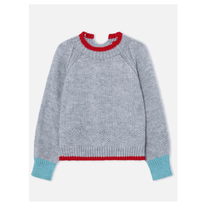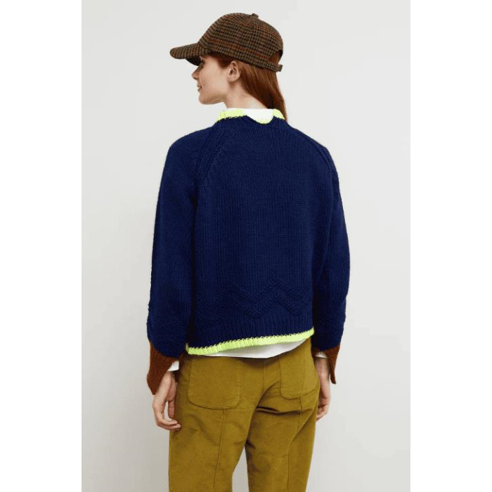 Jersey de corte recto con manga ranglán, confeccionado en punto grueso. Presenta detalle marrón en el cuello y en el bajo, que aportan un toque de contraste vibrante. Los puños están rematados en tono neón y una apertura lateral para dar movimiento y comodidad, así como en la parte trasera del cuello. El cuerpo incluye una textura en forma de zigzag que le da un acabado artesanal y distintivo.