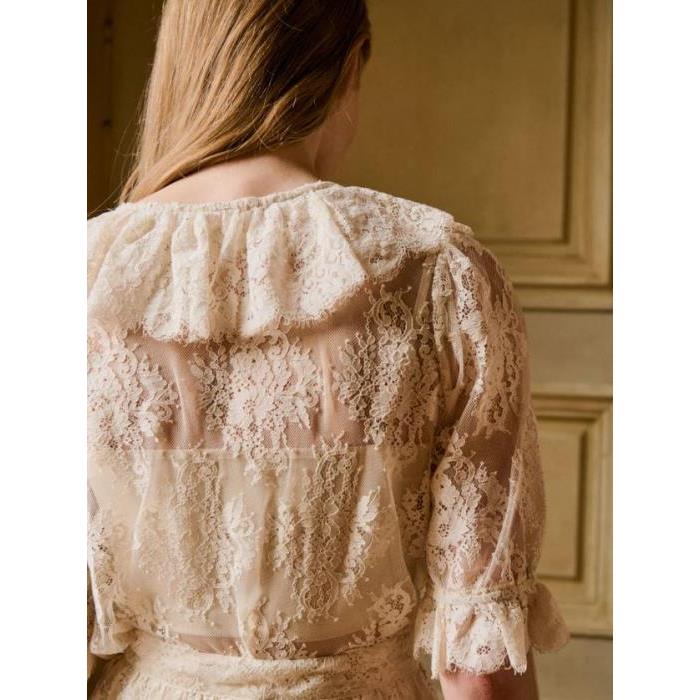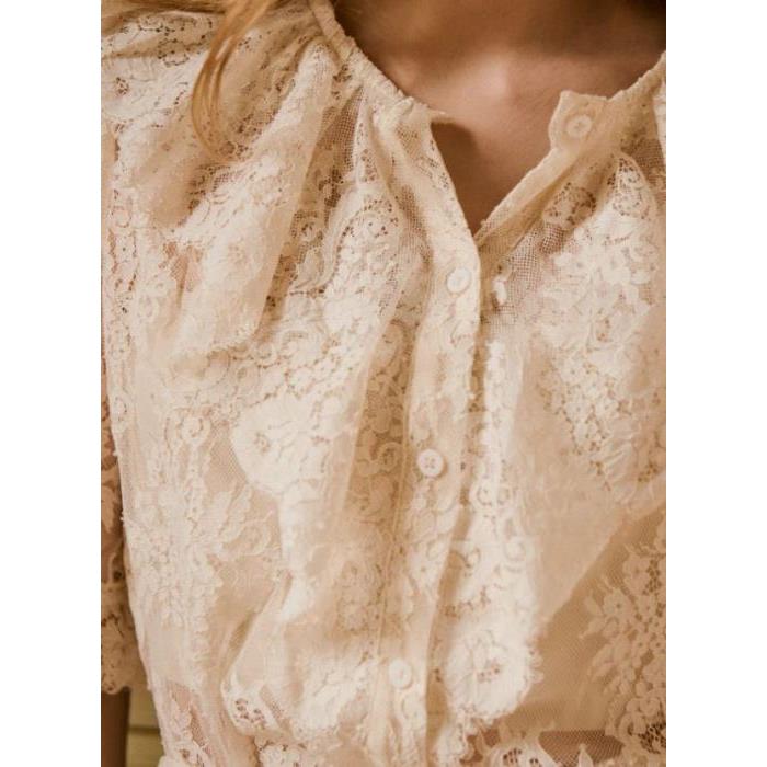 Descripción- Blusa de encaje- Cuello redondo- Mangas cortas abullonadas- Camiseta interior de tirantes- Cierre de botones- Detalles de volantes de encaje- Corte rectoLiv mide 1,73 m de altura y usa la talla S.Para la talla S, longitud total: 56,5 cm, circunferencia del pecho: 50 cm, longitud de la manga: 34,5 cm.