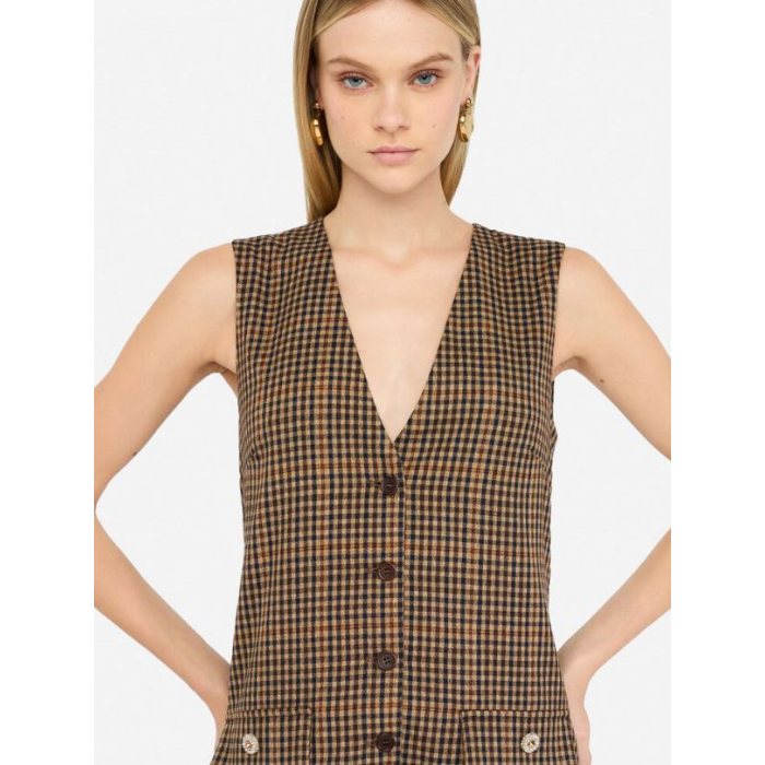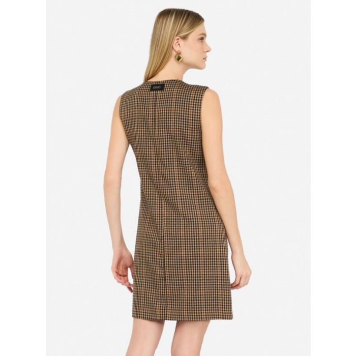 Vestido corto de cuadrosHilos de mezcla de viscosaEscote de picoBolsillos con botones decorativosCierre con botones en la parte delanteraParche con logotipo bordado en la parte trasera